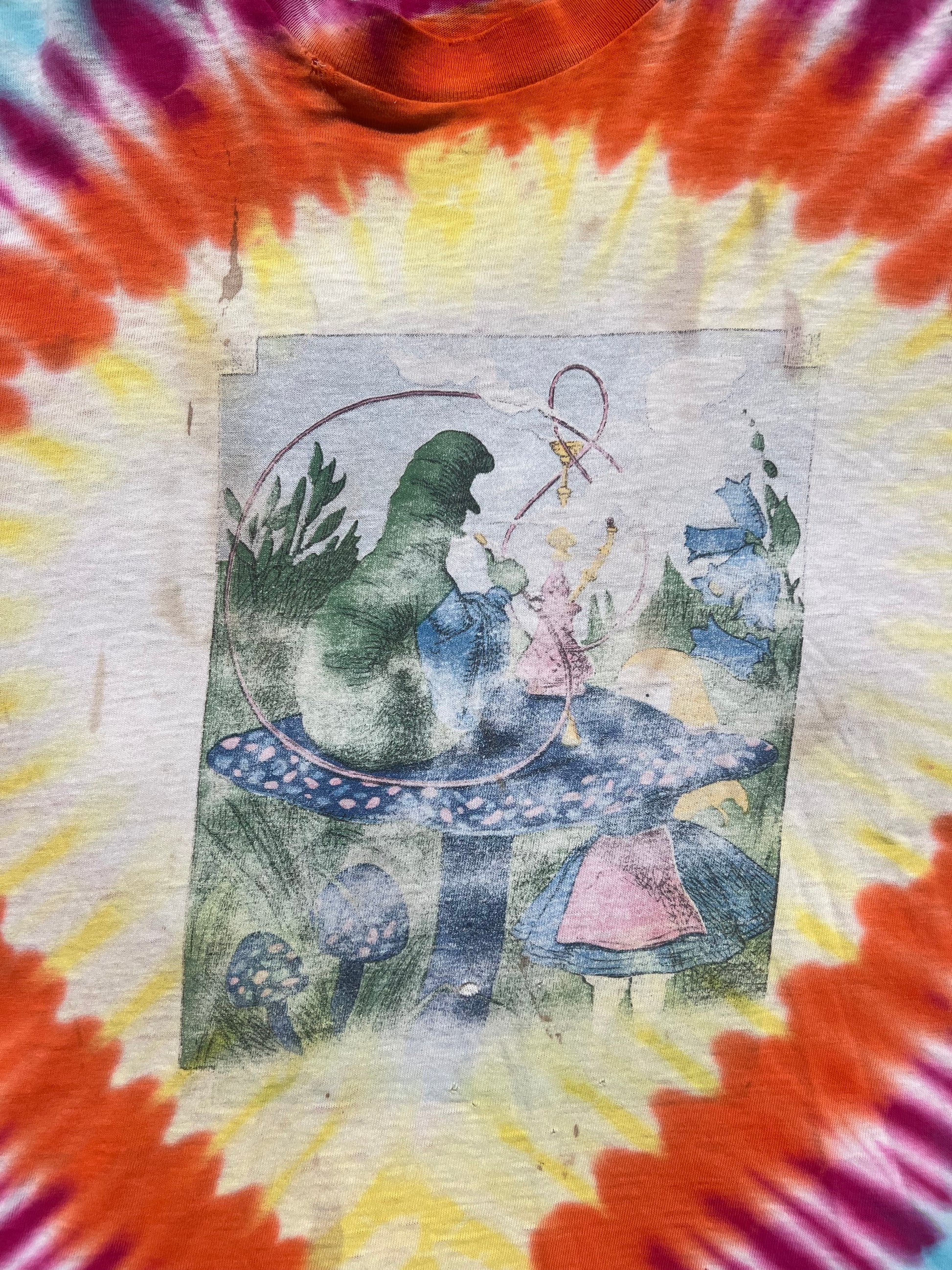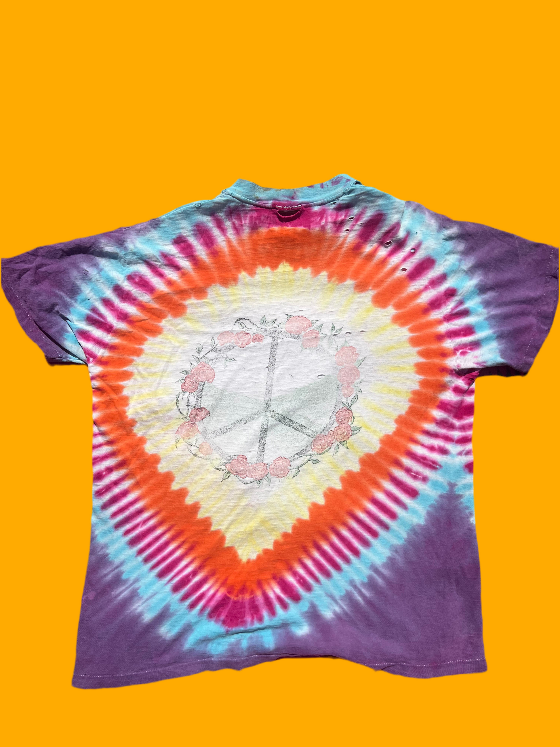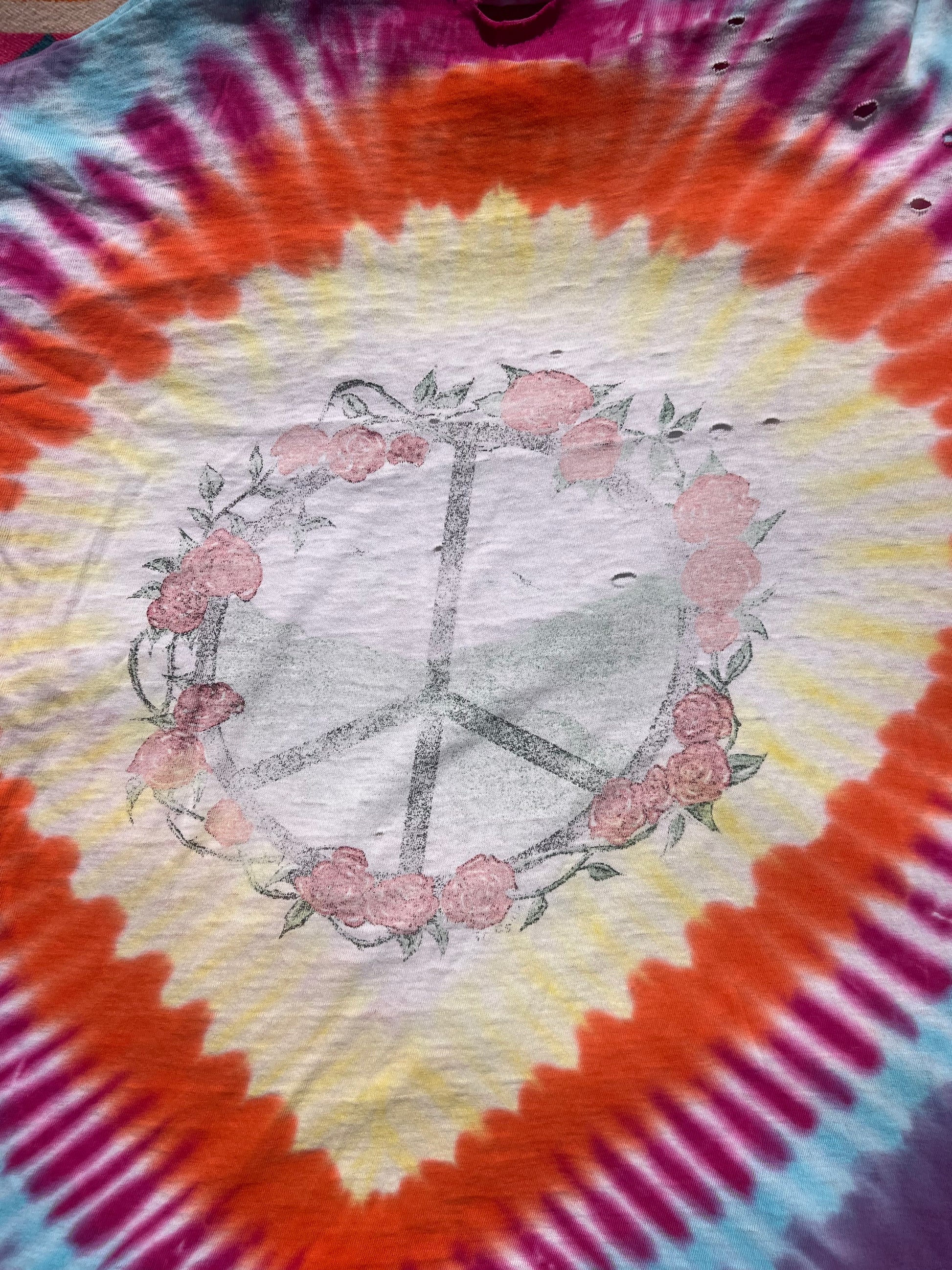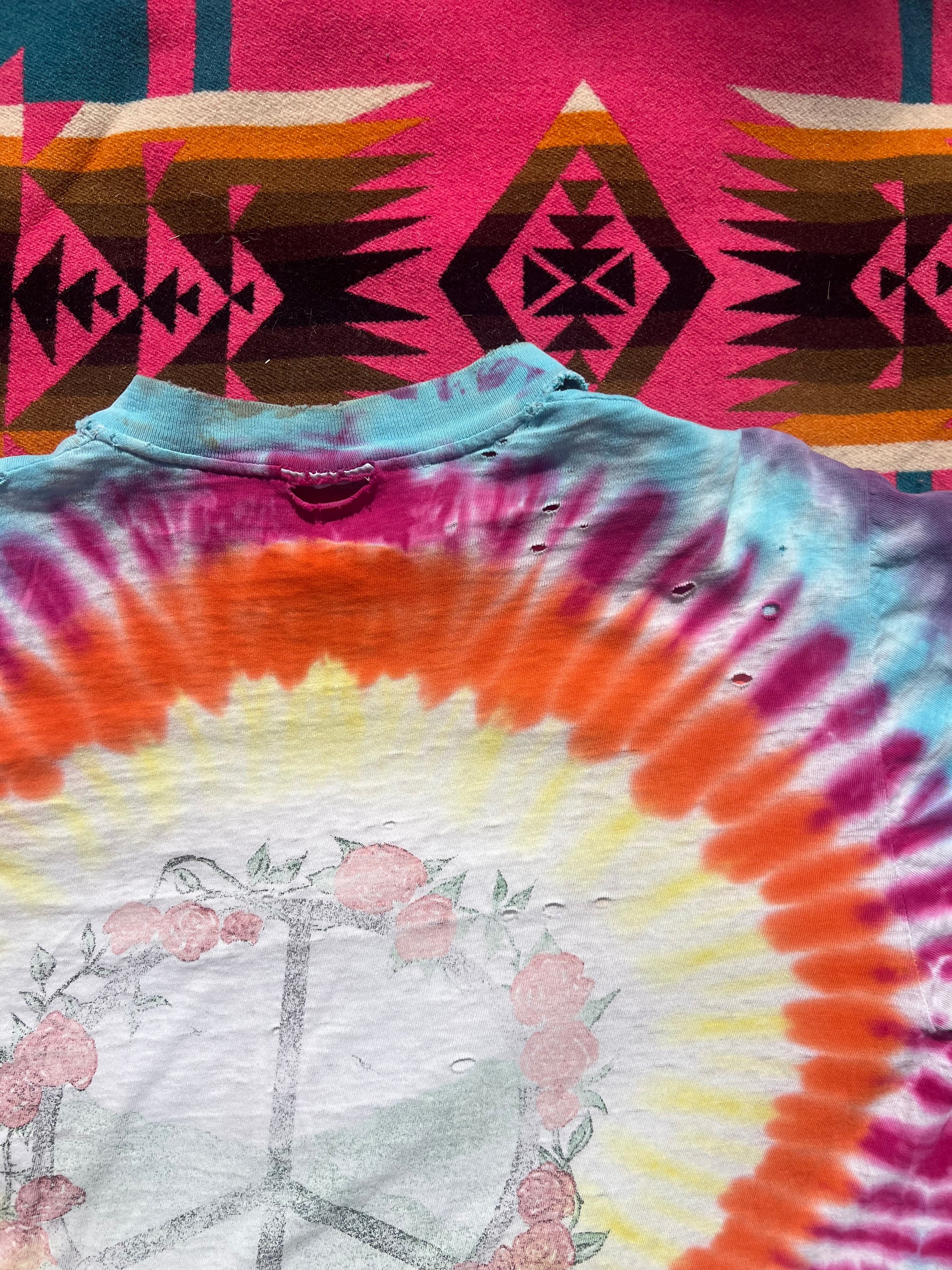 Vintage 1986 Alice in Wonderland Tie Dye with rose covered Peace sign shirt