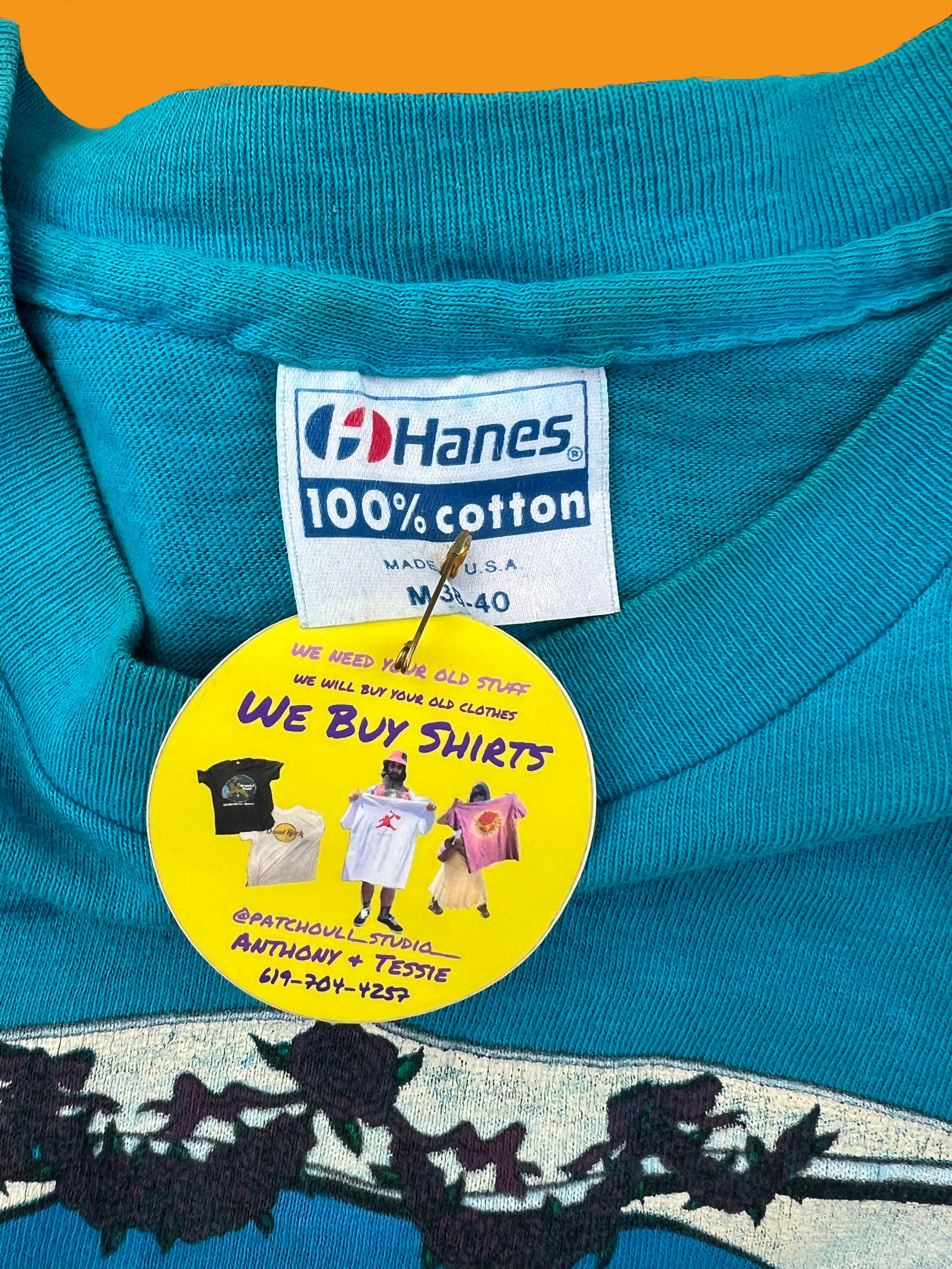 Vintage 80's Grateful Dead Greek Theatre "temple, rose, moon" turquoise short sleeve shirt